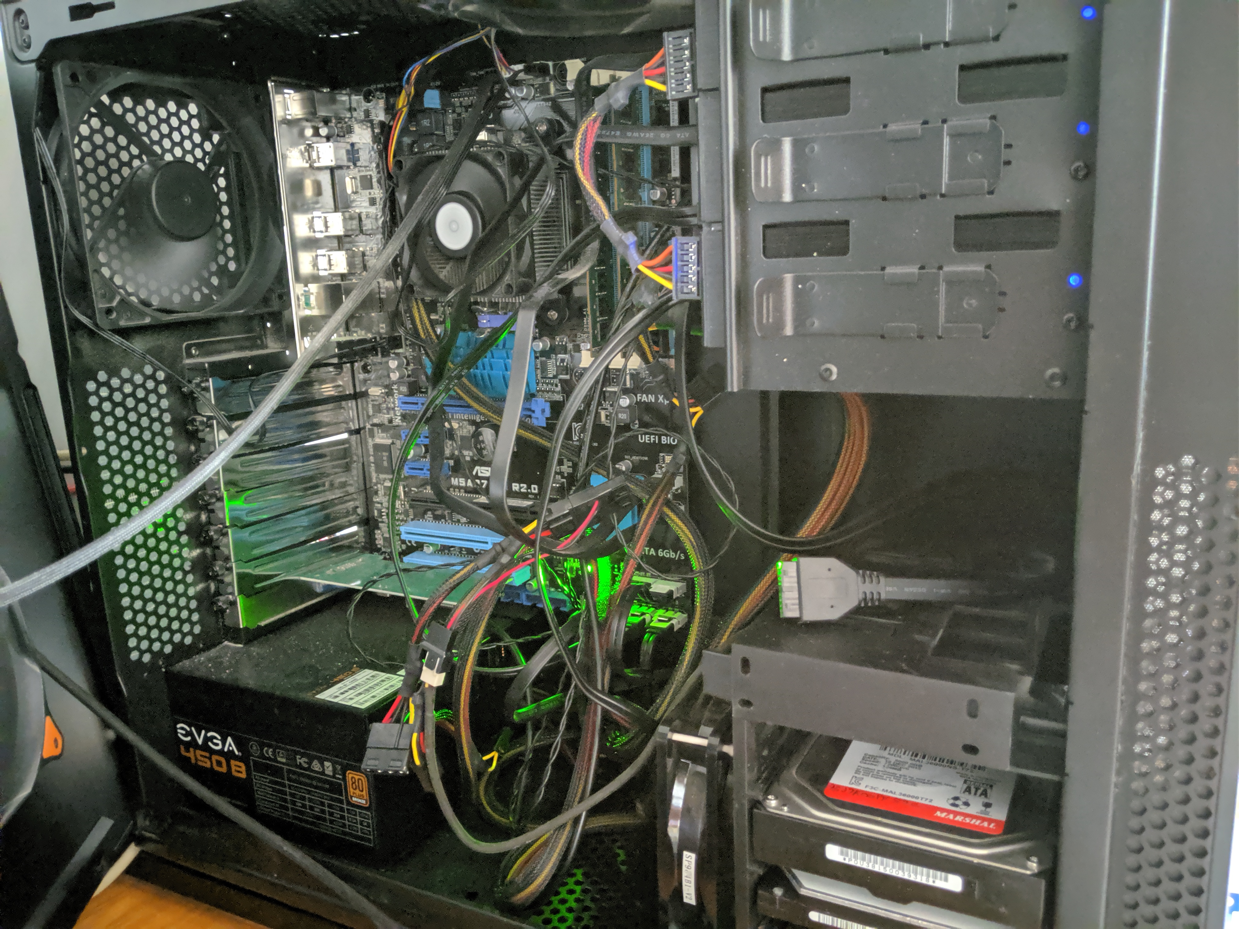Old interior cable routing, old power supply. The fan at middle bottom is taped to the bottom of the case, and has a stick glued into the upper mounting hole to keep it from leaning too close to the drives (and getting its blades blocked by mechanisms on the outside of the drive cage). Those two drives are the two that overheated before this fan was added, and after it stopped working.